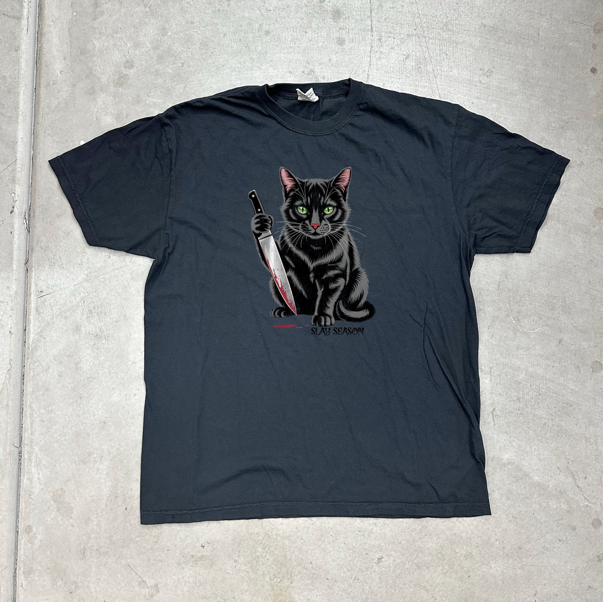 SOFT UNISEX 100% COTTON SLAY SEASON KITTY CAT ON BLACK TEE.
